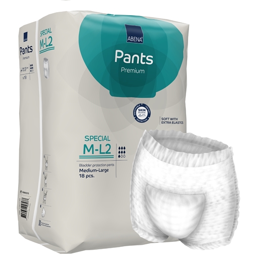 ABENA Pants Special er en førsteklasses serie af buksebleer til moderat inkontinens, der kan anvendes som normalt undertøj. Produkterne har en unik elasticitet i både ben- og skridtområdet, hvilket giver den ultimative pasform under fysisk aktivitet. Produkterne er forsynet med Top-Dry teknologi, der sikrer tør overflade, hvilket beskytter huden og øger komforten. Buksebleerne har et moderne design, er lavet af åndbart materiale og forsynet med lækagebarrierer, der yder ekstra beskyttelse. Kombinationen af disse funktioner hjælper med at beskytte huden og opretholde en naturlig hudbalance. De elastiske tråde giver en sikker og behagelig pasform og Odor-systemet minimerer risikoen for ubehagelige lugtgener.