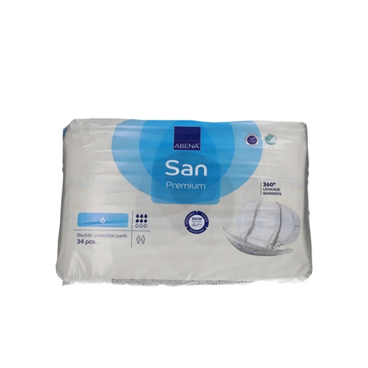 Abena San Premium 6 har lyseblå farvekode, måler 30 cm i bredden og 63 cm i længden og er beregnet til let til moderat inkontinens.