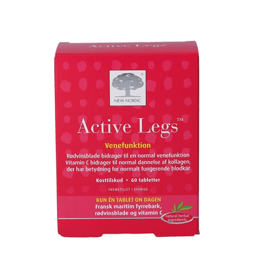 Active Legs tabletter er et kosttilskud, der indeholder en kombination af ekstrakter fra fyrrebark og vinblade, ekstrakt af sort peber samt vitamin C.