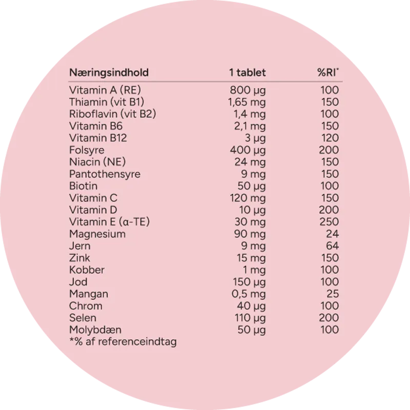 Tabletterne indeholder 12 vitaminer og 9 mineraler.