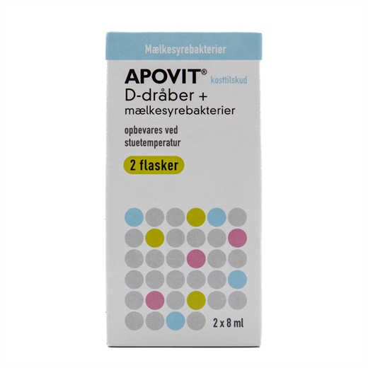 Apovit D-dråber + Mælkesyrebakterier er et kosttilskud med D-vitamin og mælkesyrebakterier fra 3 forskellige mælkesyrebakteriestammer.
