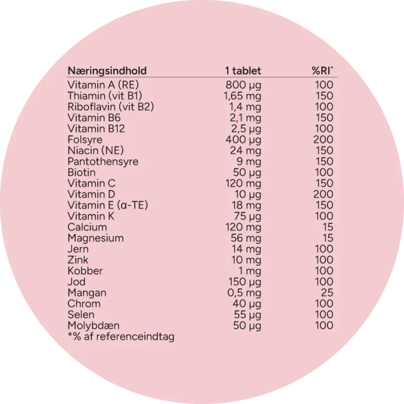 Næringsindhold pr. daglig dosis i mængde (1 tablet) og % RI*: