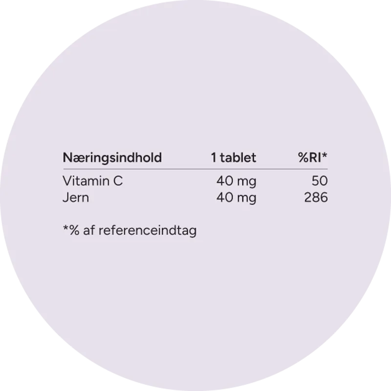 Sundhedsstyrrelsen anbefaler, at jerntilskuddet tages separat og mellem måltiderne, hvor absorptionen er bedst.