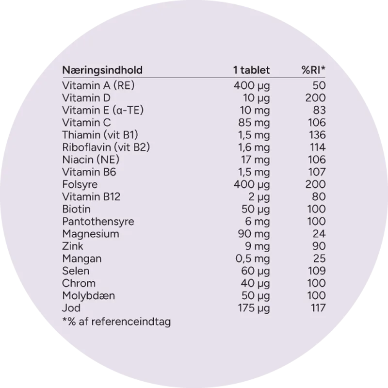 Tabletterne indeholder 12 vitaminer og 7 mineraler.