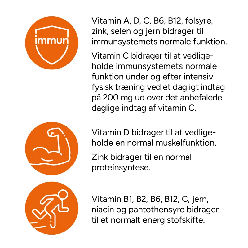 Apovit Multi appelsin er et allround multivitamin med 12 vitaminer og 4 mineraler til børn fra 3 år. Produktet er uden jod, der ikke længere anbefales i multivitaminer til børn. Indeholder bl.a. D-vitamin, der bidrager til immunsystemets normale funktion hos børn.