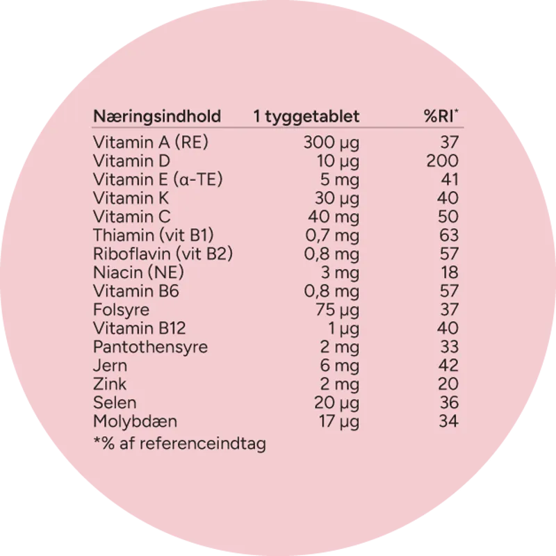 Tyggetabletten dækker behovet for vitaminer og mineraler for voksne.