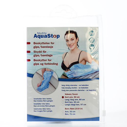 AquaStop er et vandtæt beskyttelsesovertræk, som giver en effektiv beskyttelse af gips eller forbinding ved brusebad, badning, svømning og anden vandaktivitet.