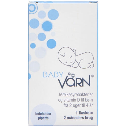 BabyVärn® er mælkesyrebakterier og vitamin D i solsikkeolie til familiens mindste, som tilfører 500 mio. lactobacillus og bifidobakterier til barnets mikrobiom.