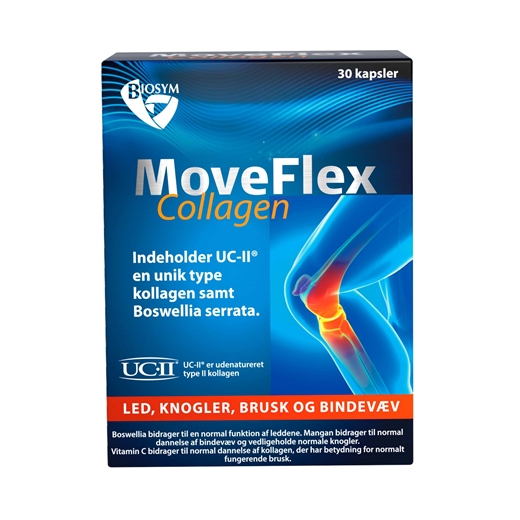 Biosym MoveFlex Collagen er et kosttilskud, der indeholder UC-II kollagen, Boswellia serrata samt vitamin C, mangan og kobber.