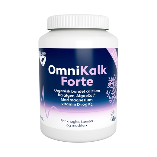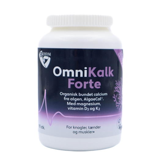 OmniKalk Forte er fremstillet af organisk calcium fra alger samt magnesium, K2-vitamin og høj dosis vegansk vitamin D3.
