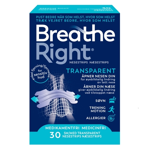 Breathe Right er transparente næsestrips /næseplastre til lindring af tilstoppet næse på grund af forkølelse, bøjet næseskillevæg og allergi.