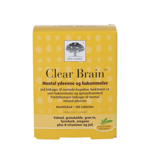 Clear Brain er et kosttilskud med naturlige ekstrakter af valnød, granatæble, fyrrebark, grøn the, oregano og peber.