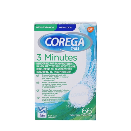 Corega Tabs 3 minutes er en rensetablet, der fjerner madpartikler, misfarvninger og plak fra protesen. Ligeledes desinficeres protesen, hvilket efterlader protesen ren og frisk.