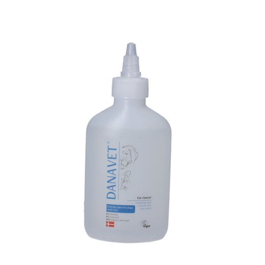 DanaVet Ørerens anvendes til rensning og pleje af øre og øregang hos hunde og katte.
