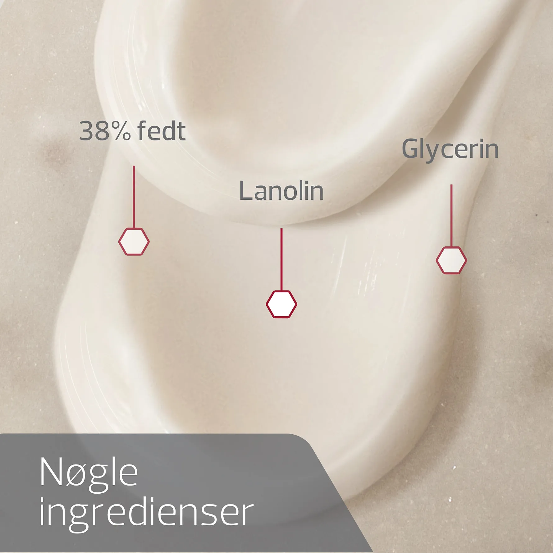 Cremen indeholder glycerin og lanolin, der giver fugt og blødgør huden.