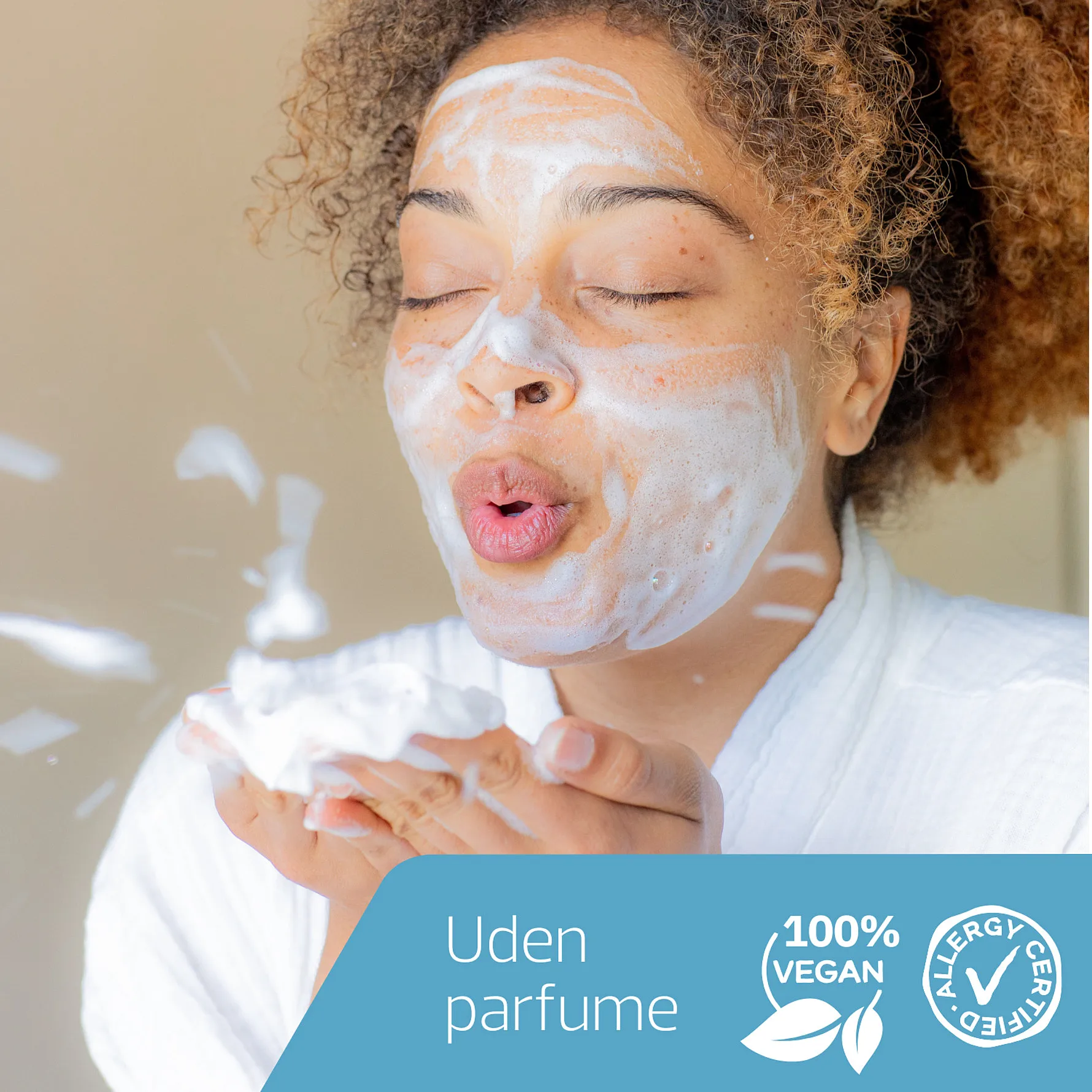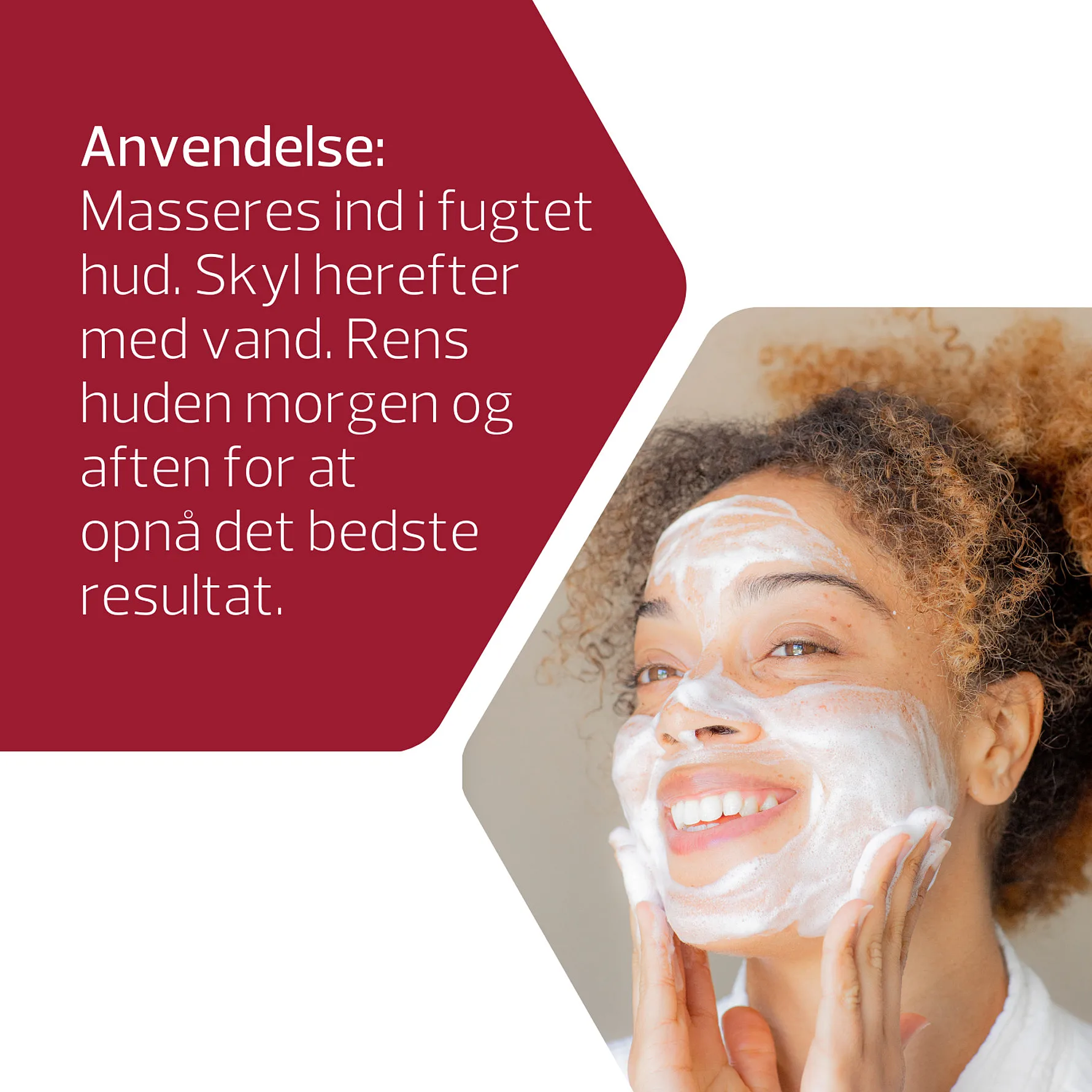 Fugt ansigtet med lunkent vand, pump lidt skum ud i håndfladen, og massér blidt skummet ind i ansigtshuden i cirklende bevægelser. Skyl grundigt med lunkent vand. Dup med et håndklæde.