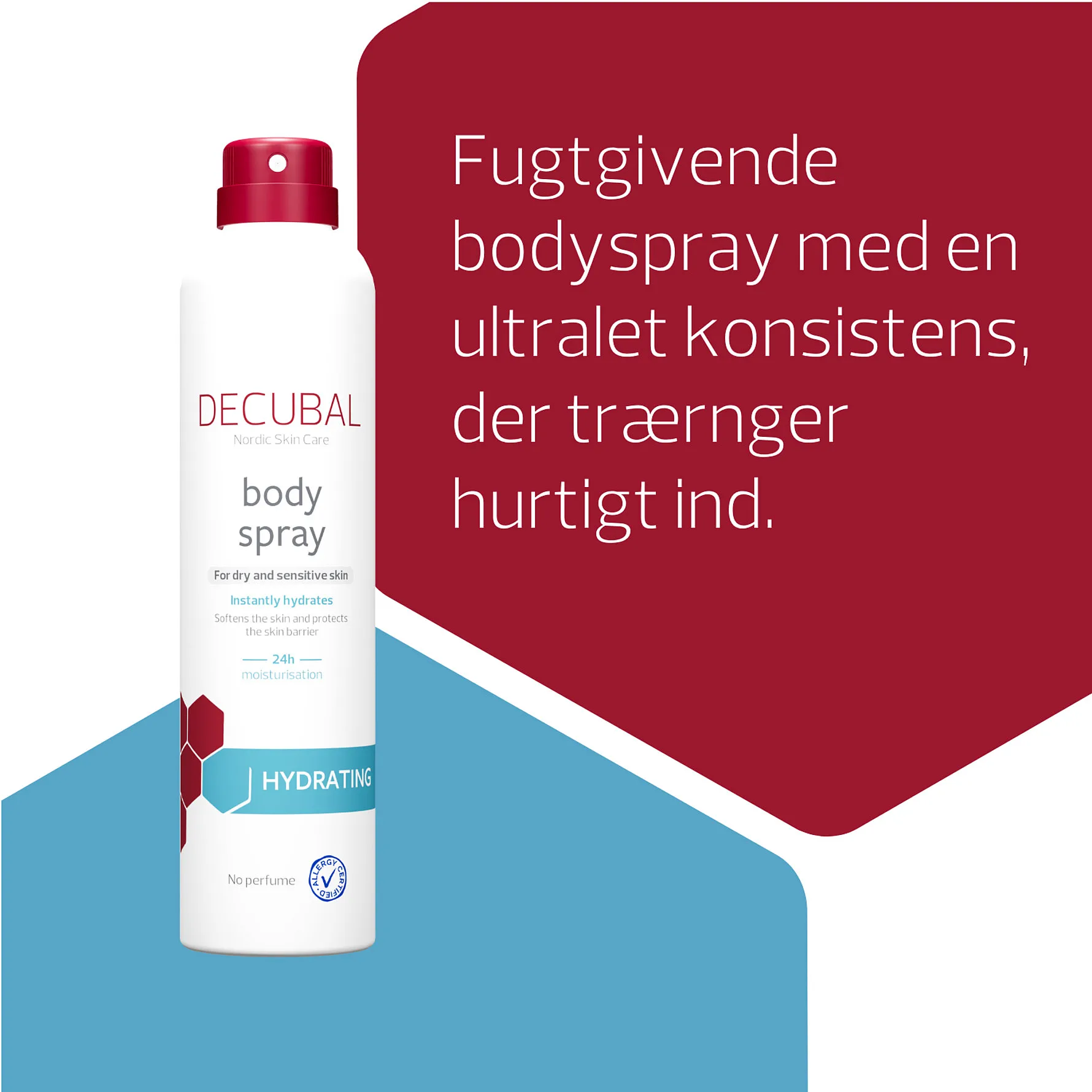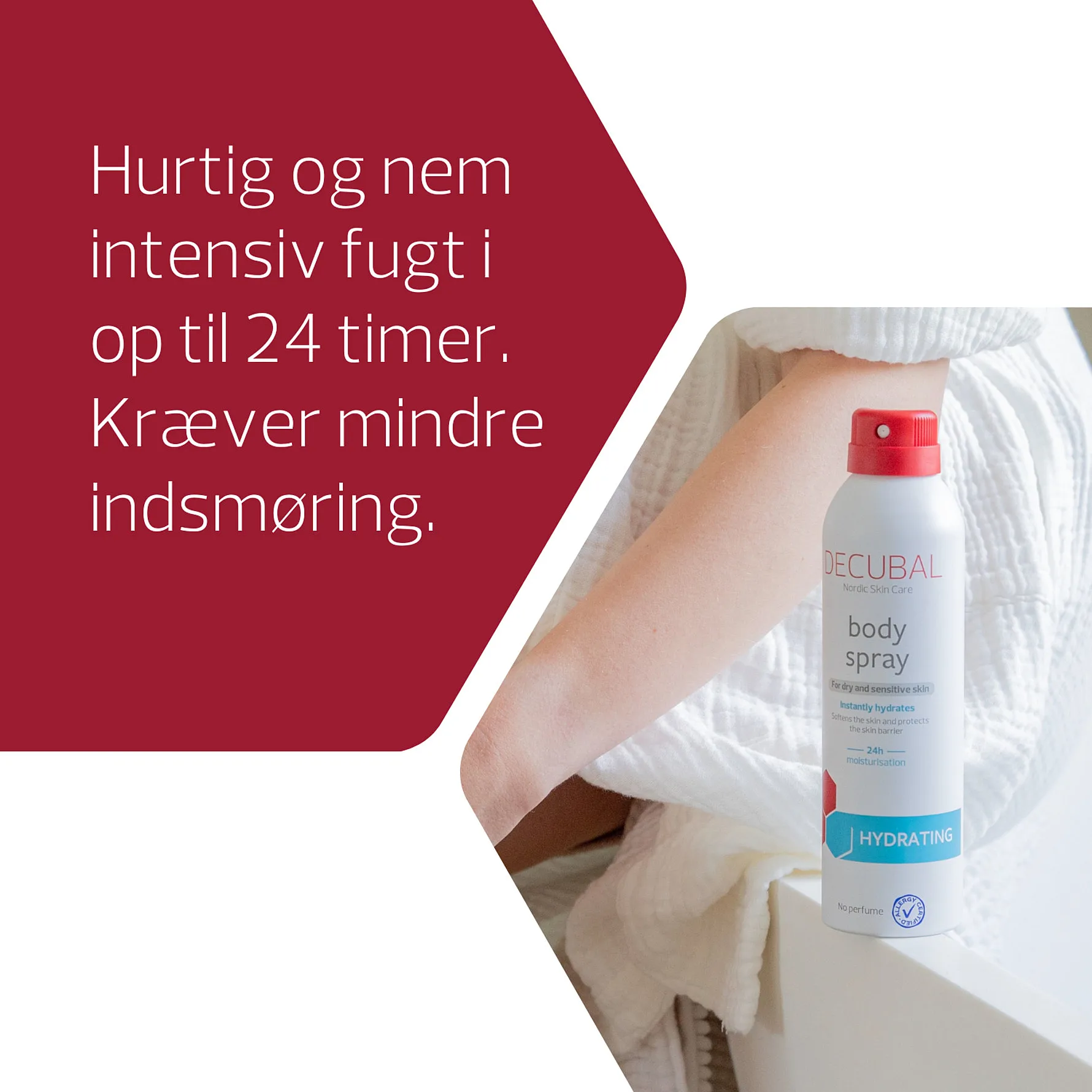 Decubal Hydrating Body Spray er en fjerlet fugtgivende lotion på spray udviklet til normal, tør og sensitiv hud. Formuleret med den innovative teknologi Tegosoft fra en naturlig kilde og glycerin, der intensiv fugter og styrket hudbarrieren.