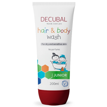 Decubal Junior Hair & Body Wash er et 2-i-1 vaskeprodukt til skånsom vask af hår og krop.