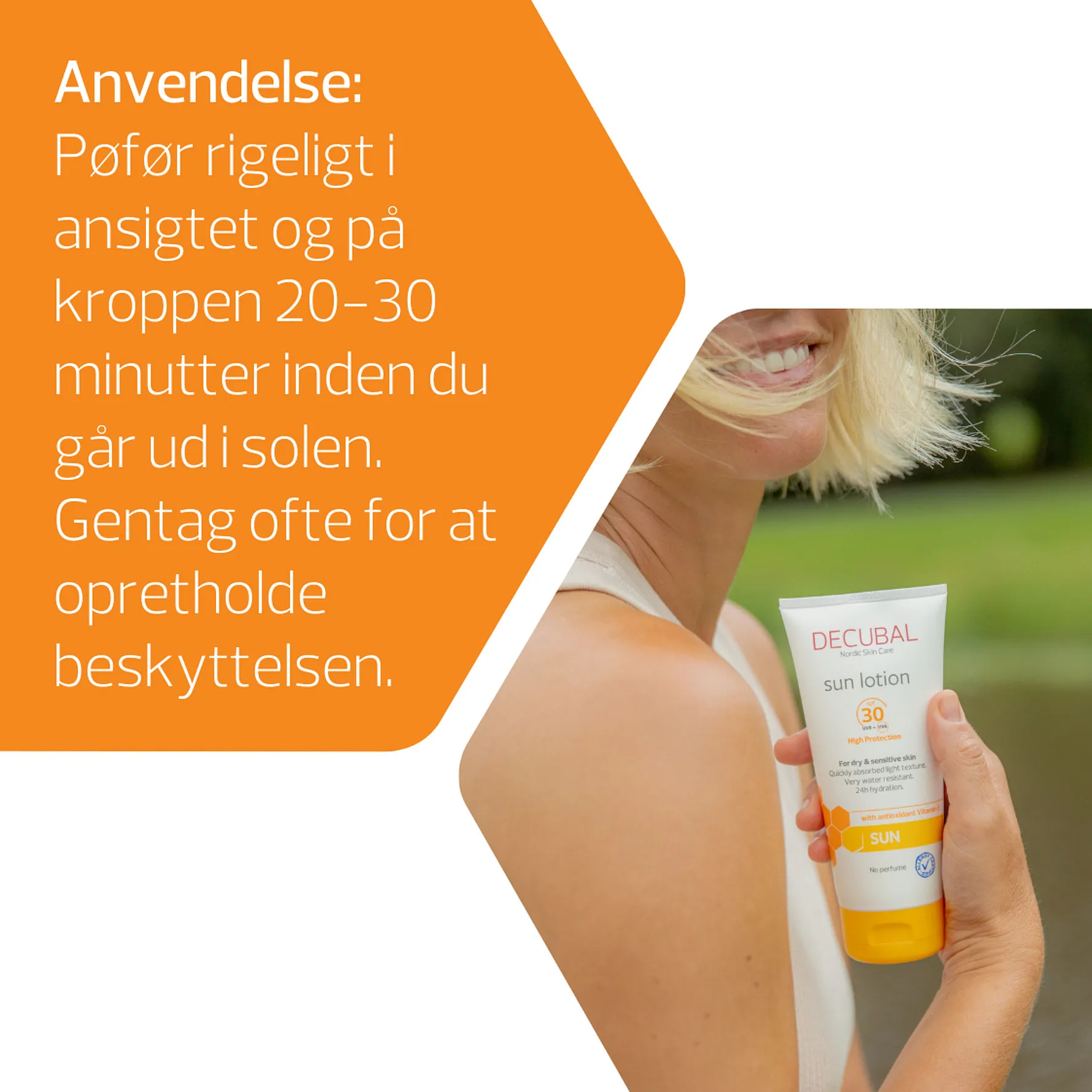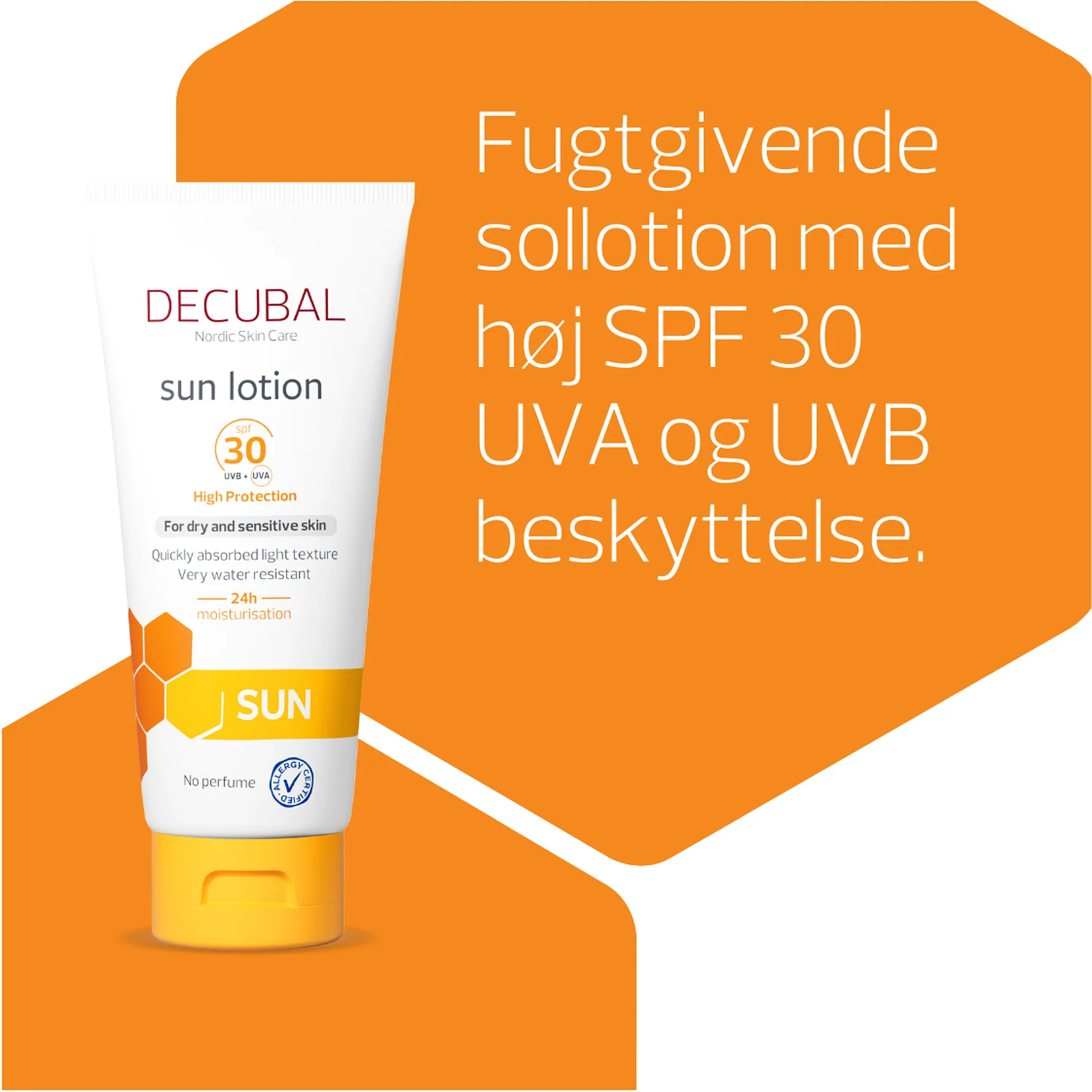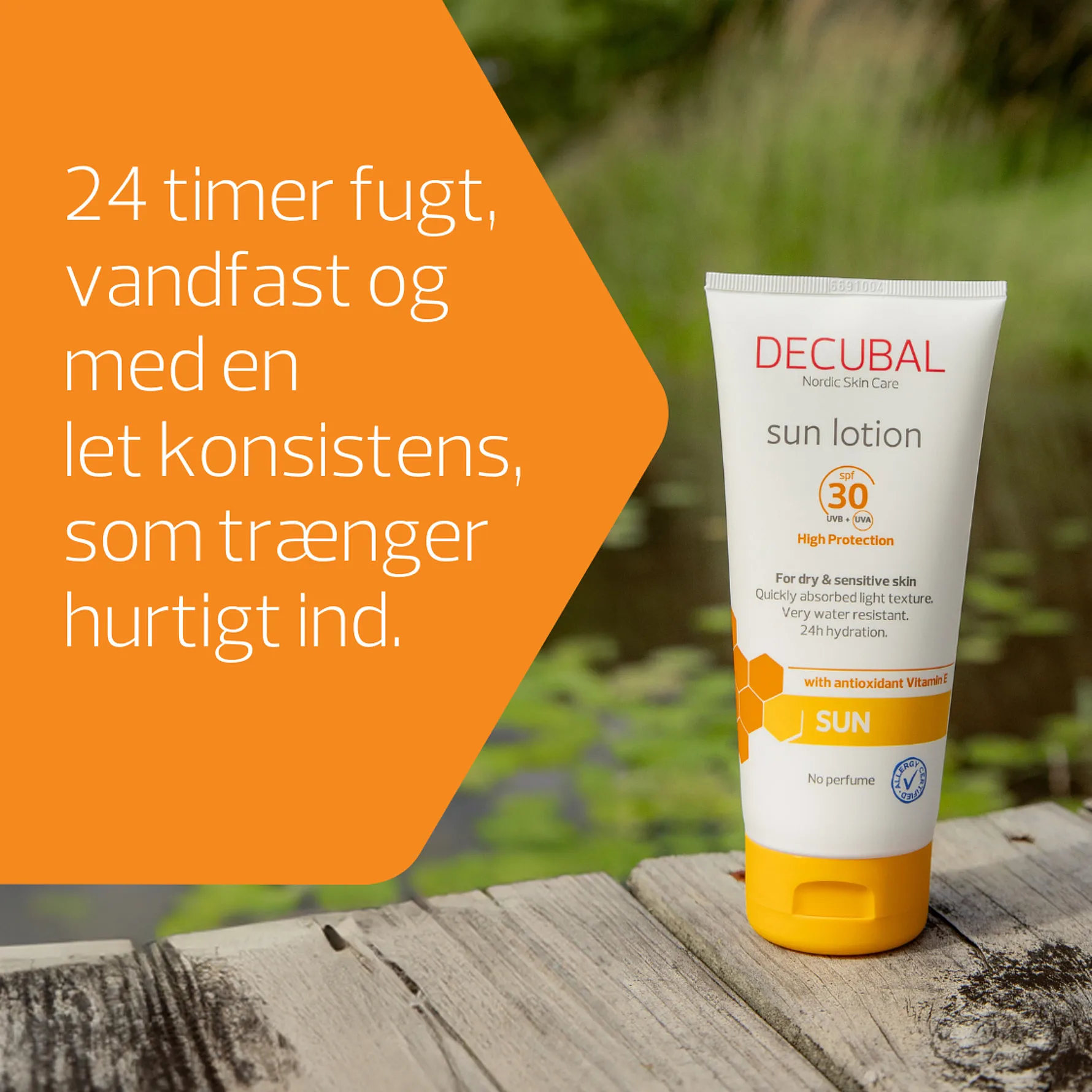 Decubal Sun Lotion SPF 30 tilbyder en høj, bredspektret beskyttelse mod solens skadelige stråler og en øjeblikkelig og langvarig fugtgivende effekt.