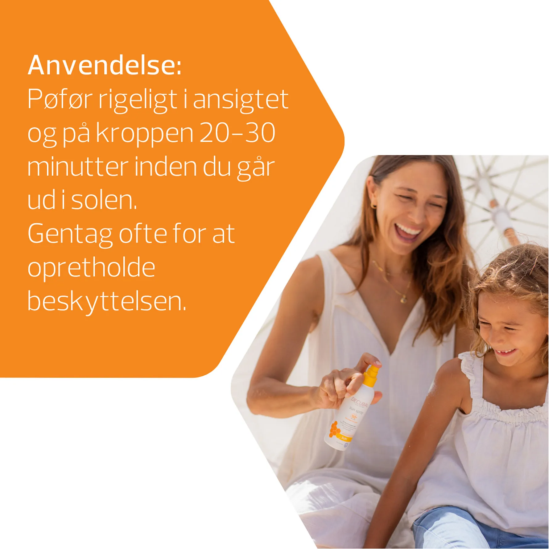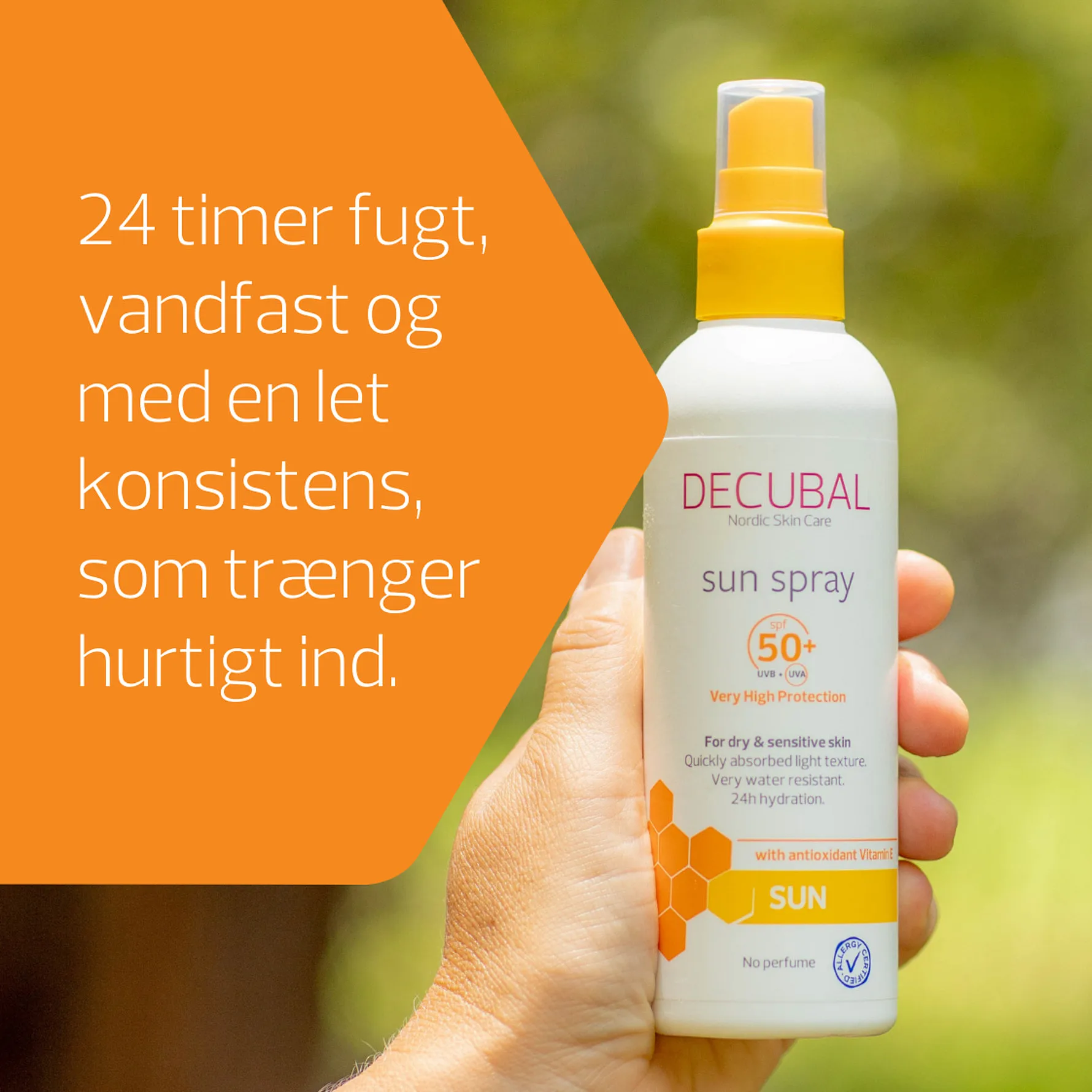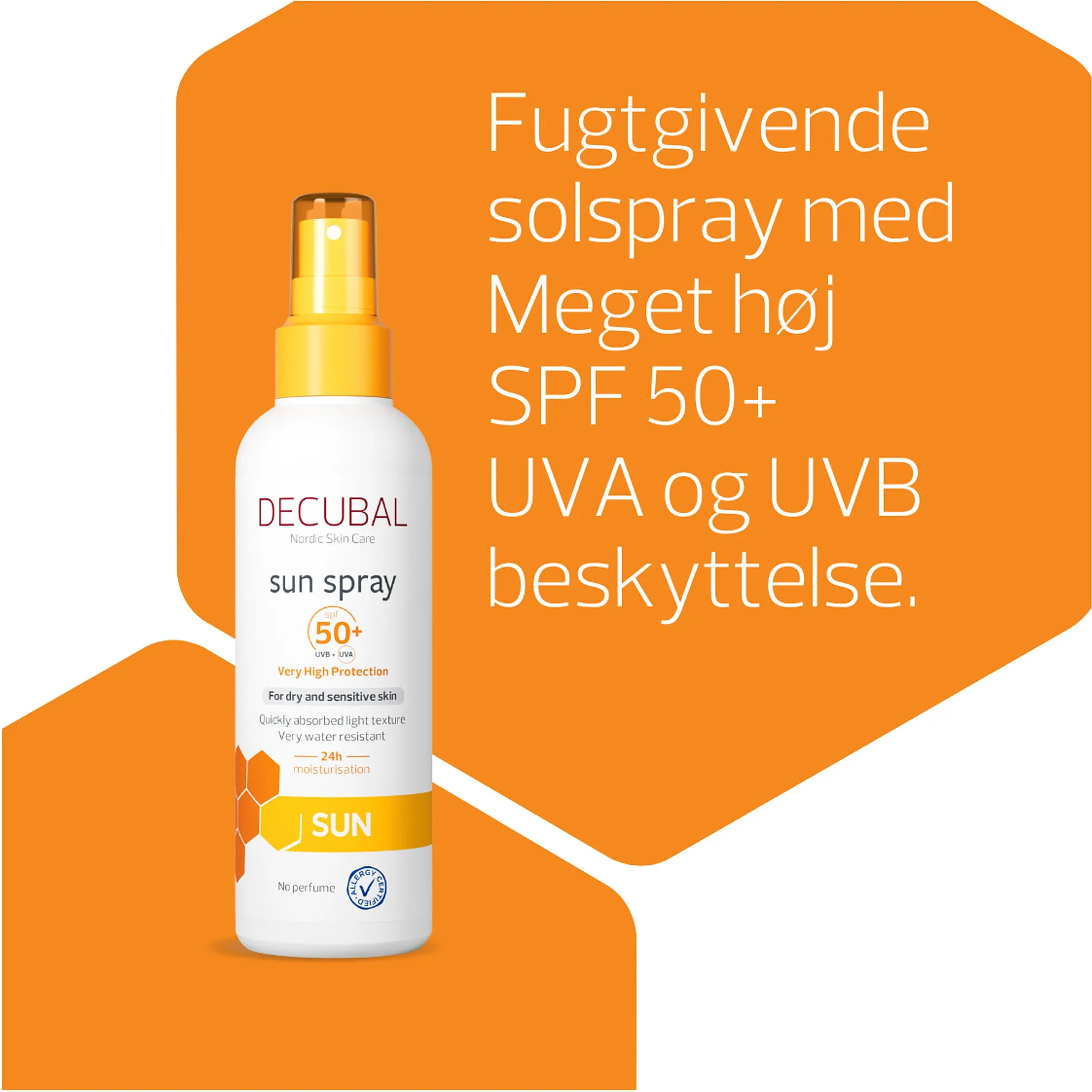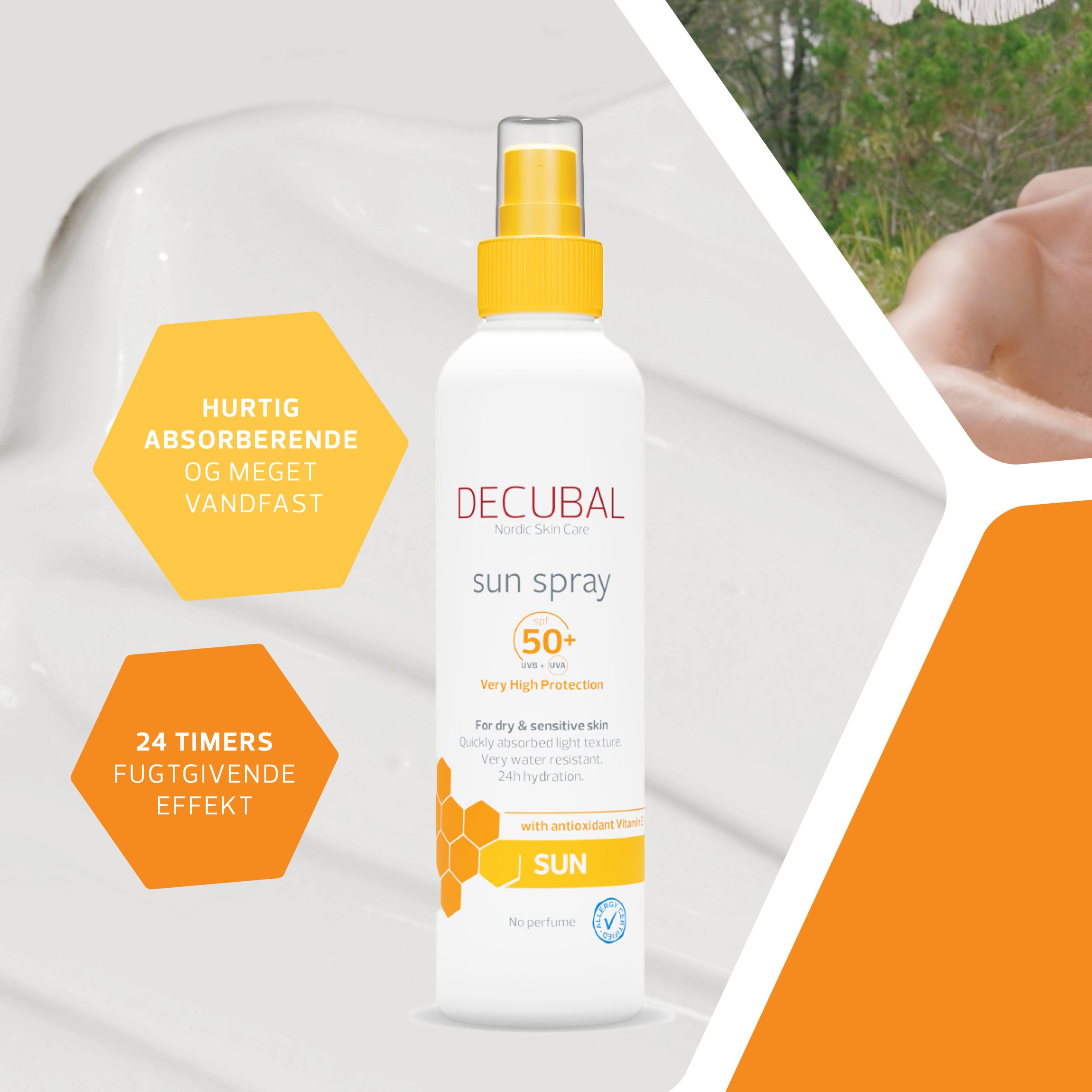 Decubal Sun Spray SPF50+ tilbyder en meget høj, bredspektret beskyttelse mod solens skadelige stråler og en øjeblikkelig og langvarig fugtgivende effekt.