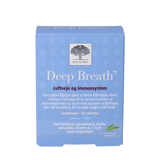 Deep Breath tabletter er et kosttilskud, der indeholder en kombination af ekstrakter fra sort kommen, japanmispel, myrte, sort peber samt magnesium og vitamin A, C og D.