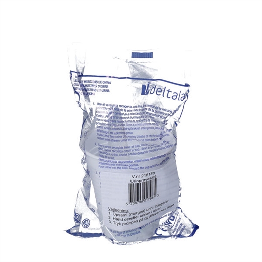 Sættet består af et bæger til opsamling af urin samt et spidst urinrør med skruelåg.