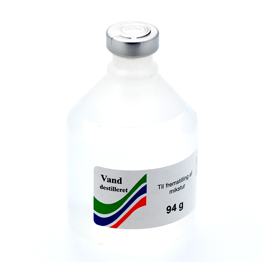 Flasken indeholder en præcis afmålt mængde destilleret vand i en gennemsigtig plastikflaske med forseglet låg.