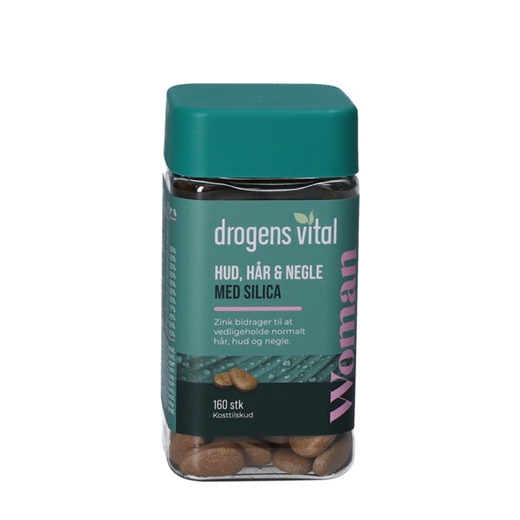 Drogens Vital Woman Hud, hår & negle er et kosttilskud, der udover agerpadderok og ølgær også indeholder vitaminer og mineraler, som bidrager til vedligeholdelse af normal hud, hår og negle.