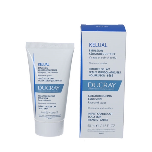 Ducray Kelual Emulsion er en mild emulsion til klæbende skæl i ansigtet og hårbunden samt til behandling af arp hos børn.