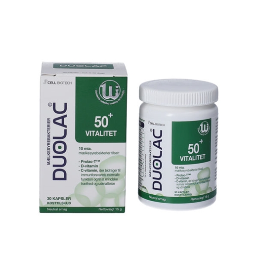 Duolac 50+ Vitalitet er kapsler med et dagligt tilskud af mælkesyrebakterier, Prolac-T, vitamin C og D.