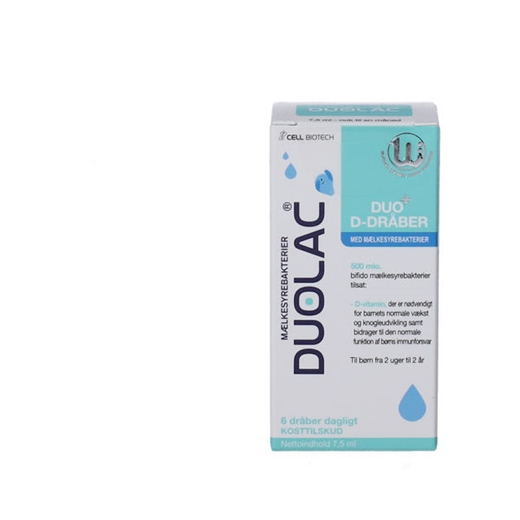 Duolac Duo+ D-dråber er et kosttilskud med D-vitamin og mælkesyrebakterier fra 4 forskellige mælkesyrebakteriestammer.
