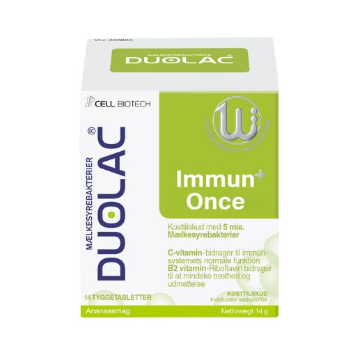 DUOLAC IMMUN+ ONCE er en 14-dages kur med 5 mia. levende mælkesyrebakterier fra 7 nøje udvalgte stammer, kombineret med vitamin C og vitamin B2. Vitamin C bidrager til immunsystemets normale funktion, mens vitamin B2 hjælper med at mindske træthed og bidrager til at vedligeholde normale slimhinder. Kan anvendes af hele familien fra 3 år.