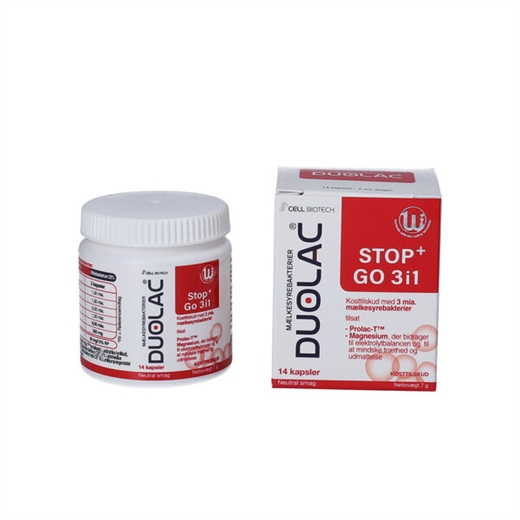 Duolac Stop+ Go 3 i 1 er et kosttilskud med et dagligt tilskud af mælkesyrebakterier , Prolac-T og magnesium.
