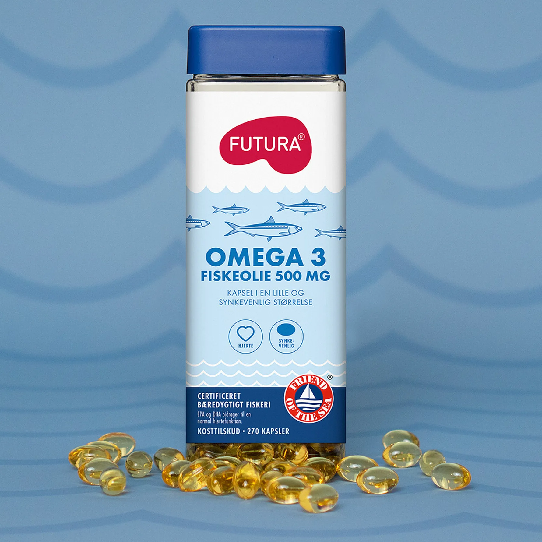 FUTURA Omega 3 Basic er lavet i en lille og glat kapselform, der er nem at synke – også for dem, der ikke bryder sig om at sluge kosttilskud. De kommer endvidere i en bøtte af 100% genanvendt plast og er ydermere Friend of the Sea certificeret.