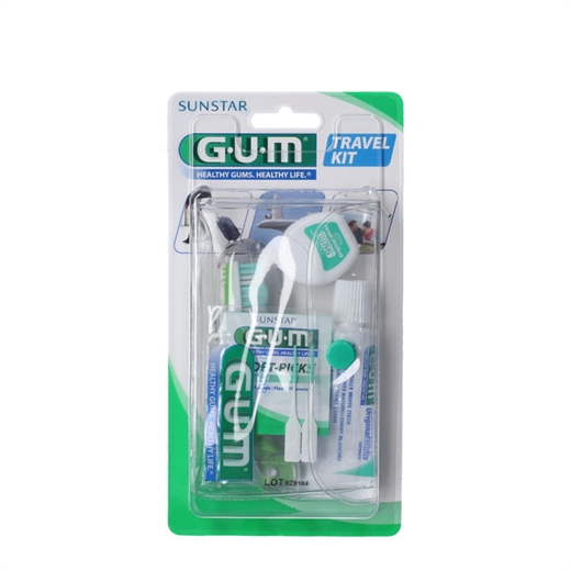 GUM Travel Kit er et praktisk rejsesæt med 1 stk. tandbørste (med tilhørende etui), 1 stk. GUM Original tandpasta i rejsestørrelse, 2 stk. GUM Soft-Picks tandstikker (Regular) og 10 m GUM Original White tandtråd.