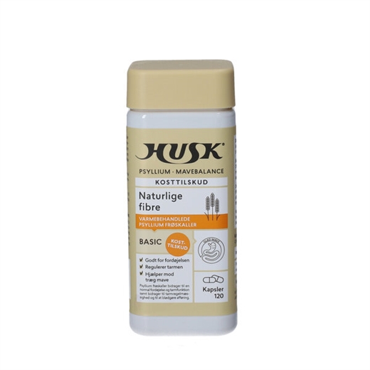 HUSK Psyllium Mavebalance Kapsler er et kosttilskud med naturlige fibre fra varmebehandlede loppefrøskaller (Psyllium frøskaller).