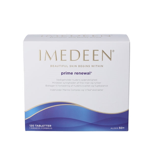 Imedeen Prime Renewal er et kosttilskud med Marine Complex (fiskeekstrakt), ViTea (ekstrakt af hvis te, vitamin C, tomatekstrakt (indeholdende lycopen), vindruekerneekstrakt og vitamin E), zink og kamilleekstrakt til forbedring af hudens kvalitet og fugtbalance.