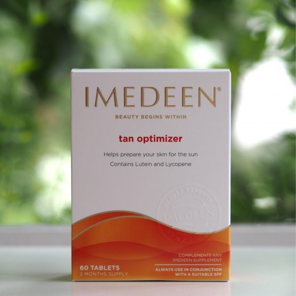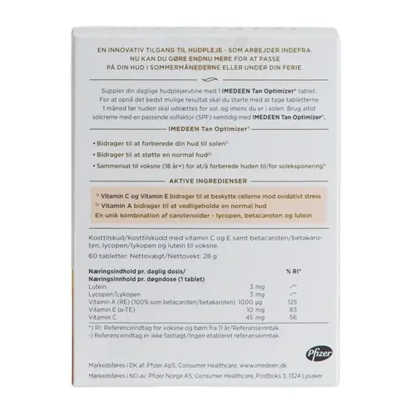 Imedeen Tan Optimizer er et kosttilskud med vitamin C og E samt betacaroten, lycopen og lutein.