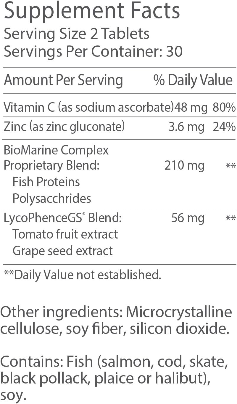 Marine Complex™(fiskeekstrakt), fyldemiddel (mikrokrystallinsk cellulose), sojafibre, vitamin C, antiklumpningsmiddel (siliciumdioxid), zinkgluconat, tomatekstrakt, vindruekerneekstrakt.