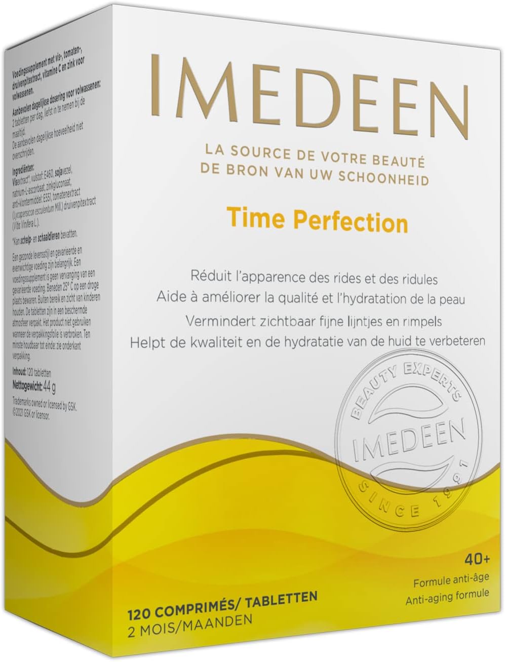 Imedeen Time Perfection er et kosttilskud med Marine Complex (fiskeekstrakt), tomatekstrakt, vindruekerneekstrakt, vitamin C og zink til forbedring af hudens kvalitet og fugtbalance.