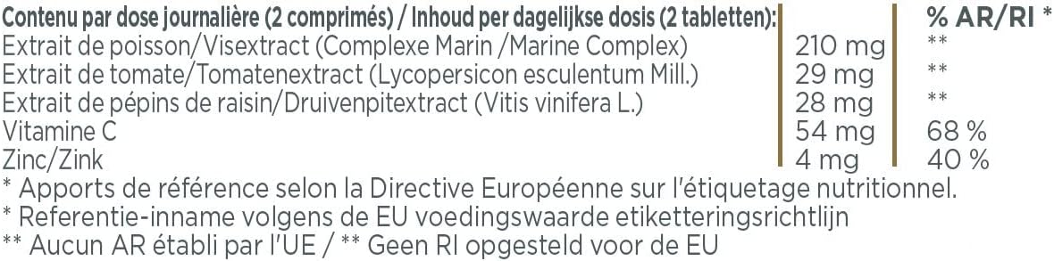 Marine Complex™(fiskeekstrakt), fyldemiddel (mikrokrystallinsk cellulose), sojafibre, vitamin C, antiklumpningsmiddel (siliciumdioxid), zinkgluconat, tomatekstrakt, vindruekerneekstrakt.
