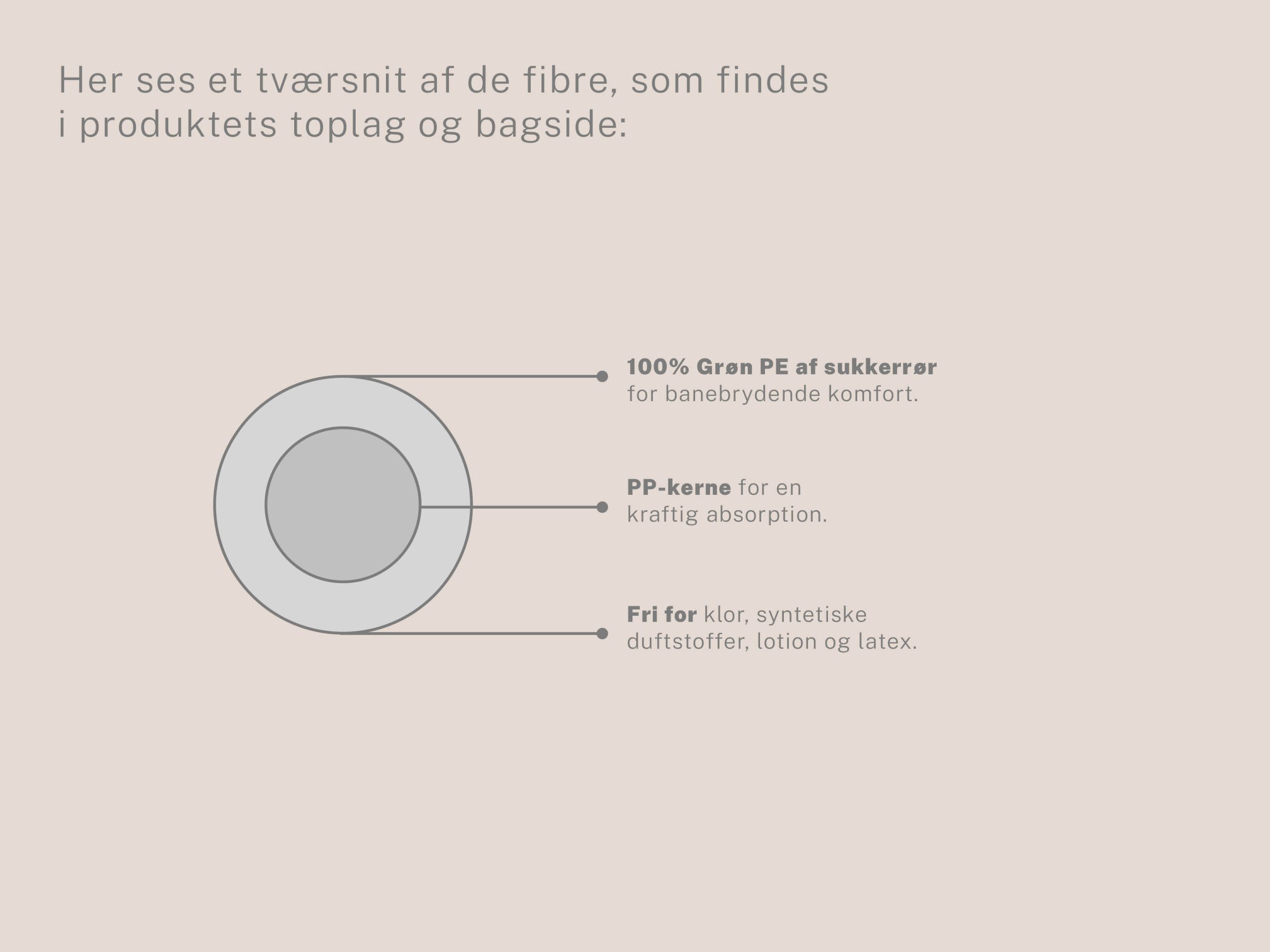 De øverste lag i vores buksebleen er 100% plantebaserede og har en fugttransporterende egenskab. De transporterer effektivt fugt væk fra huden, hvilket sørger for max tørhed og beskyttelse.