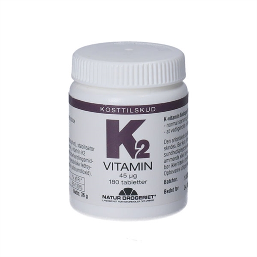 Naturdrogeriets K2-vitamin tabletter er et kosttilskud med indhold af 45 mikrogram K-vitamin.