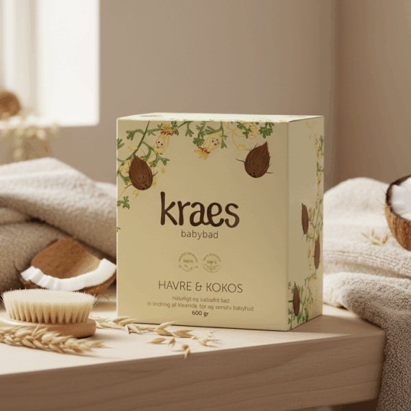 KRAES babybad med havre & kokos er et naturligt og sæbefrit bad til dagligt/ugentligt brug.