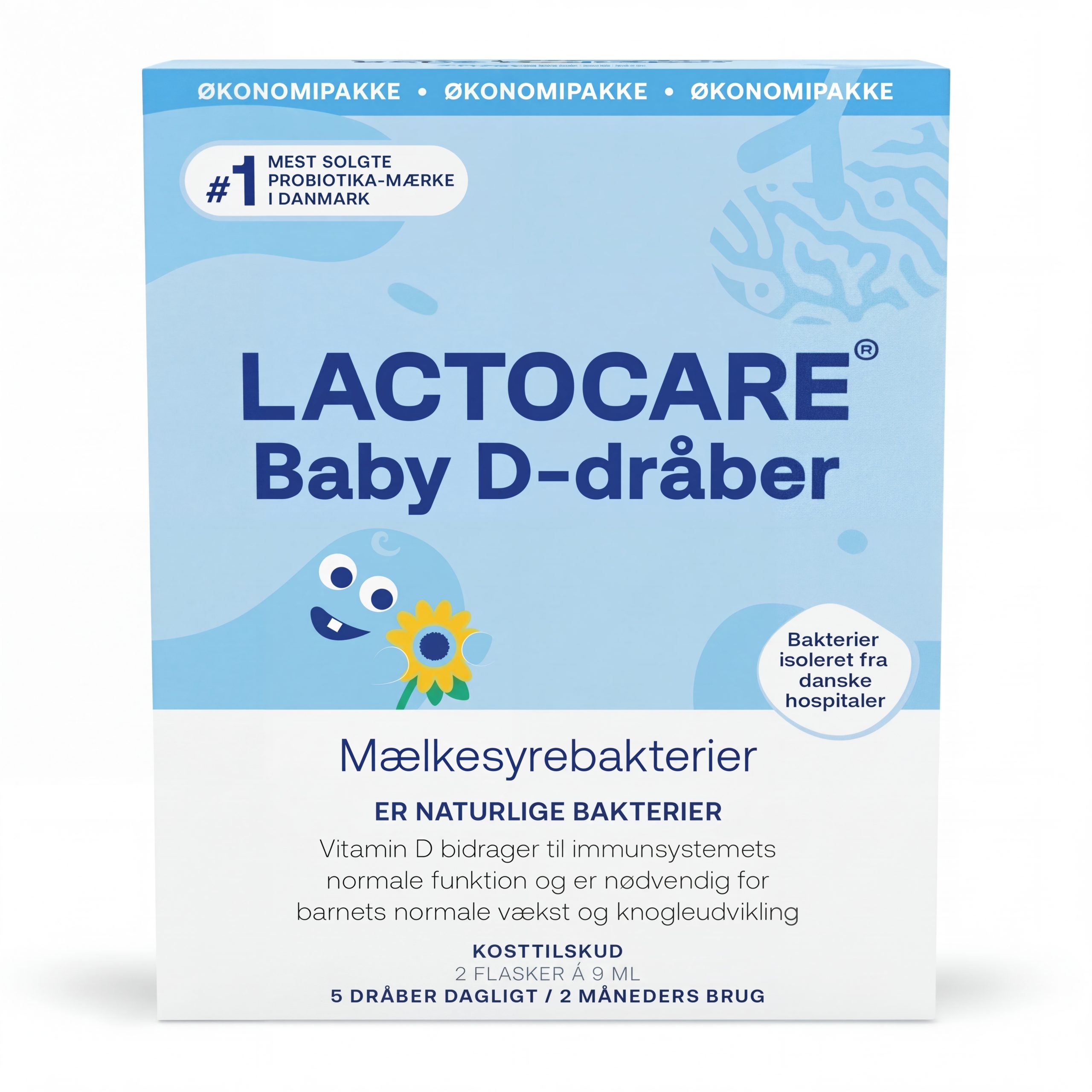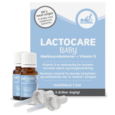Lactocare BABY er et 2-i-1 kosttilskud, der indholder et dagligt tilskud af 250 millioner levende mælkesyrebakterier samt 10 µg D-vitamin.