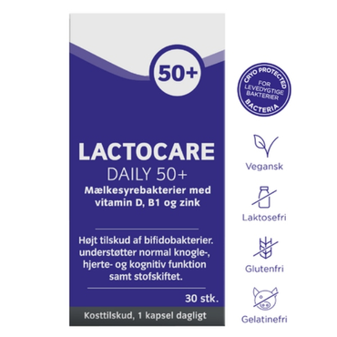 Lactocare 50+ er en skræddersyet formel til 50+ segmentet med særligt fokus på et højt tilskud af bifidobakterier.