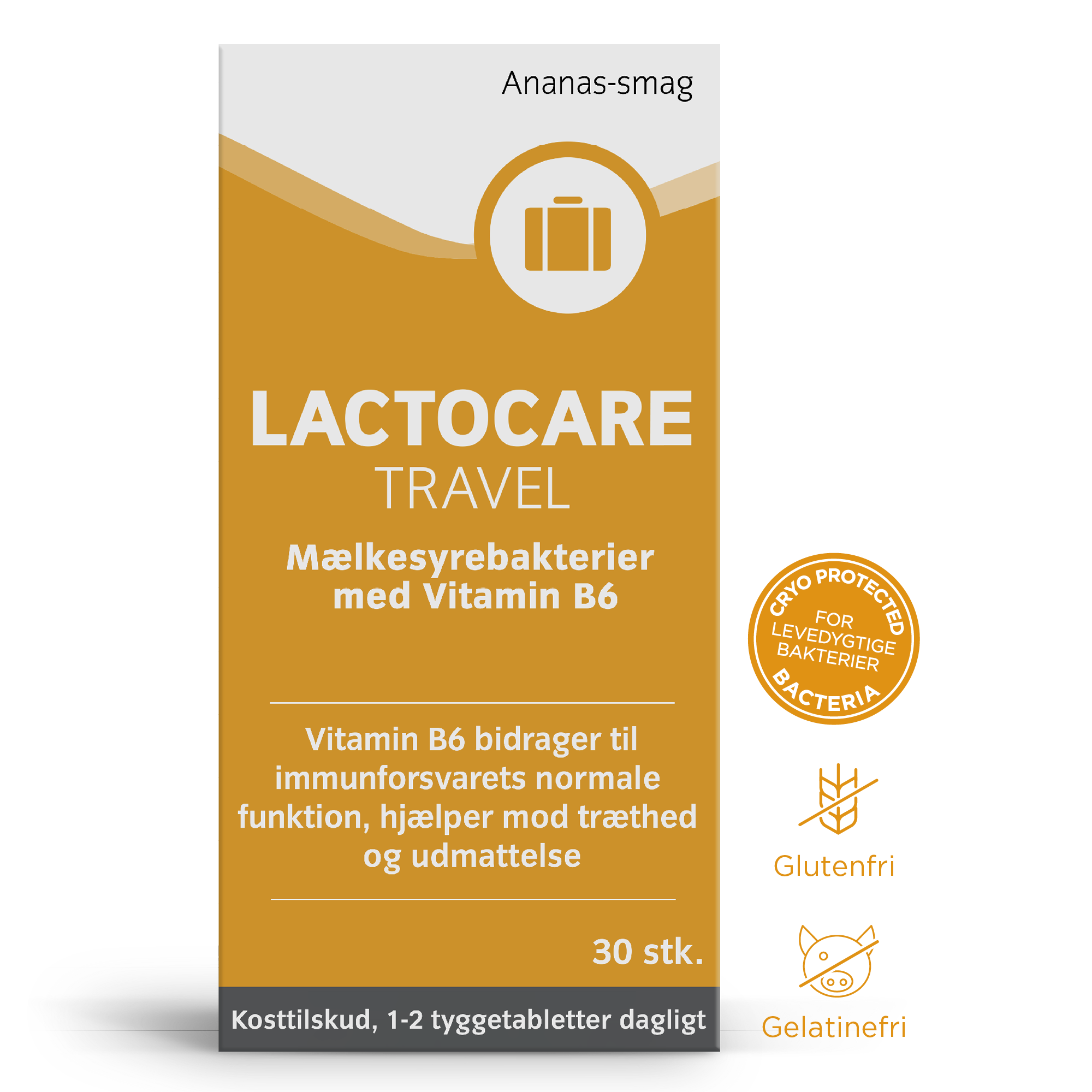 Lactocare TRAVEL er et kosttilskud, der indholder et dagligt tilskud af 2,5 milliarder levende mælkesyrebakterier, 4 millarder varmebehandlede mælkesyrebakterier samt 0,21 mg vitamin B6 pr. tyggetablet.