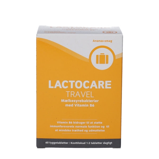 Lactocare TRAVEL er et kosttilskud, der indholder et dagligt tilskud af 2,5 milliarder levende mælkesyrebakterier, 4 millarder varmebehandlede mælkesyrebakterier samt 0,21 mg vitamin B6 pr. tyggetablet.