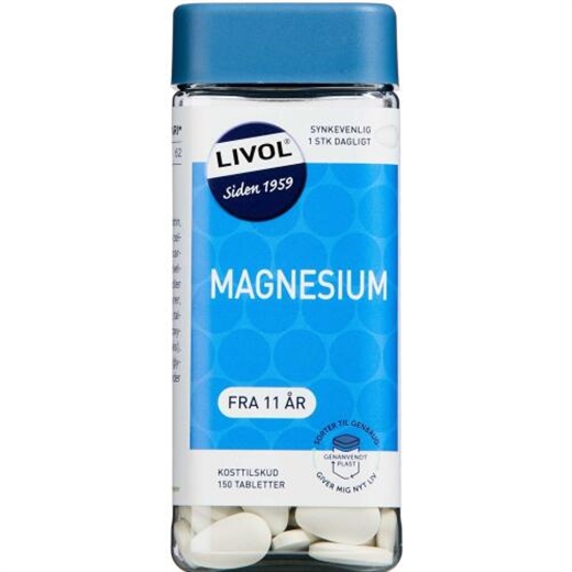 Livol Magnesium indeholder magnesium, der bidrager til en normal muskelfunktion samt nervesystemets normale funktion. Magnesium hjælper endvidere til at mindske træthed og udmattelse samt til et normalt energistofskifte. Magnesium hjælper til at vedligeholde normale knogler og normale tænder.