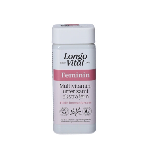 Longo Vital Feminin er et kosttilskud, der indeholder vitaminer, mineraler (herunder ekstra jern) og 6 udvalgte urter – rosmarinblad, paprika, græskarkerner, pebermynteblad, røllikeblomst og hvidtjørnblad og –blomst.